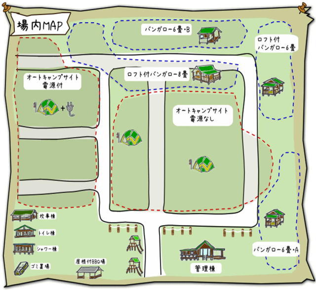 チェックイン / アウト | 14:00〜18:00 / 11:00(バンガローは10:00) |
